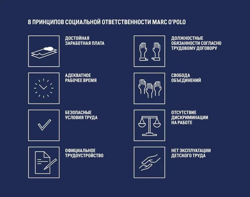 Цепочка поставок текстильной промышленности чрезвычайно сложна и сопряжена со многими проблемами - как экологическими, так и социальными. Мы предъявляем высокие требования к качеству нашей продукции. Мы тщательно подбираем материалы, придаем большое значение их качественному изготовлению. В то же время для нас важно, чтобы наша продукция производилась в достойных условиях. Для сотрудничества с нашими поставщиками мы разработали Кодекс поведения, который включает в себя основные международные принципы и соглашения по правам человека и охране труда, включая обеспечение безопасных рабочих мест, права на свободу создания профсоюзов и прожиточный минимум, а также запрет на детский труд. Чтобы усилить наше влияние в этом вопросе, мы являемся членами организации “Фонд справедливой одежды” (Fair Wear Foundation).